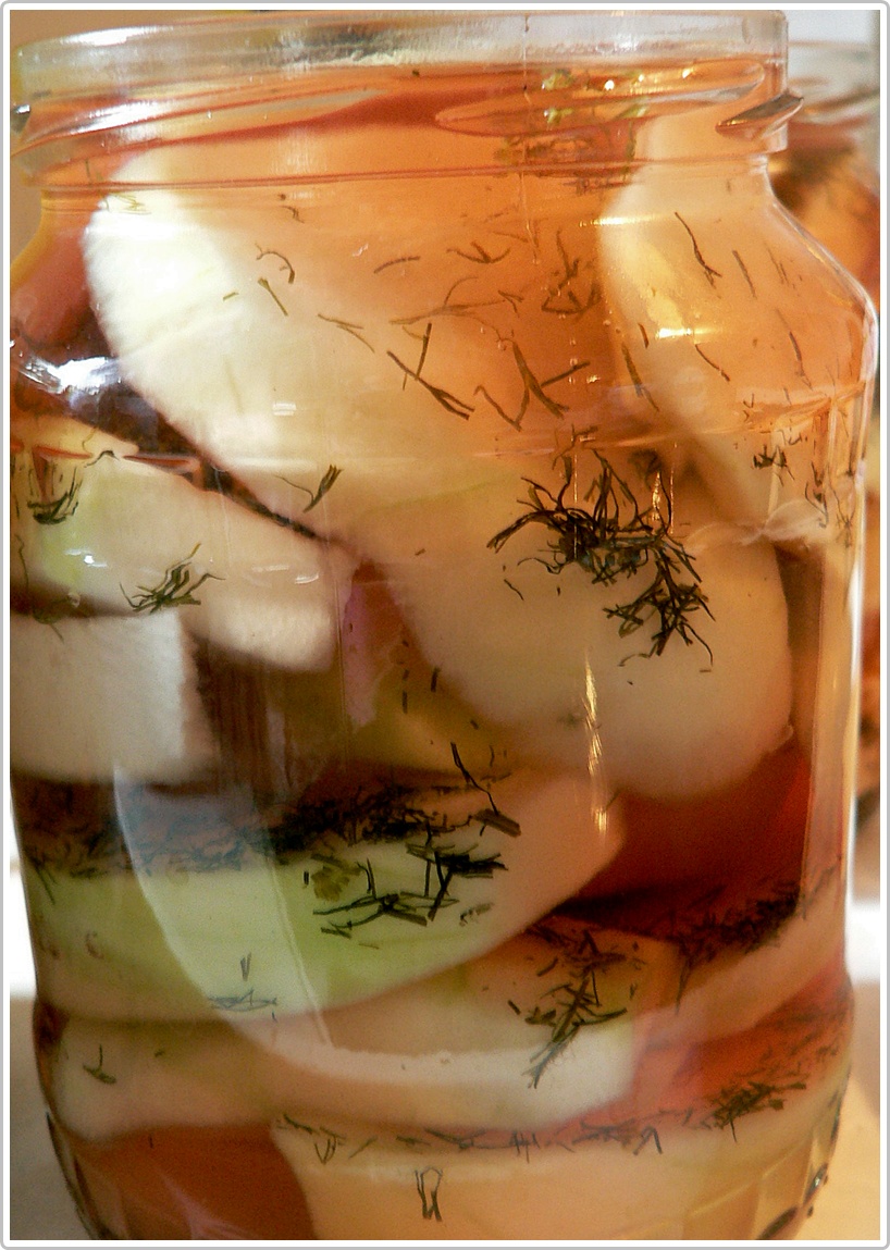 Amit ma sikerült eltennem: zöld paradicsom savanyúan, illetve csillagtök hagymás-kapros borecetben. Már pihennek a száraz dunsztban. Elkezdtem előkészíteni a töklekvárnak valót is, bár ez holnapra fog maradni, mert elfelejtettem megvenni a citromot…. és az uborka eltevése is hátra van még, de nem baj, mert imádok télire eltenni legyen szó savanyúságról, gyümölcsről vagy lekvárról.