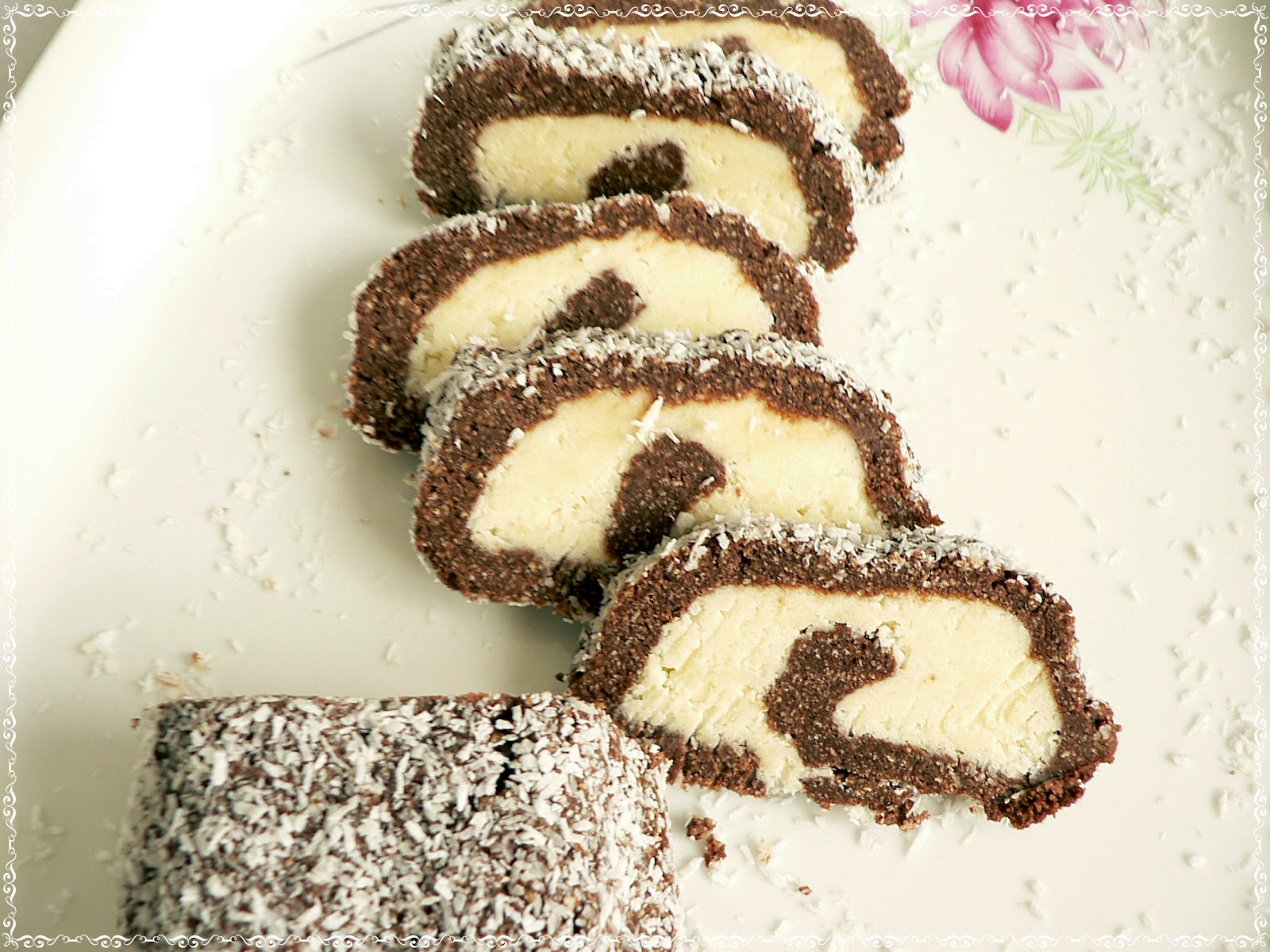 A barna tészta hozzávalóit jól eldolgozzuk(robotgép késes részével is kiválóan összeállíthatjuk, utána már csak egyszer át kell gyúrni), kétfelé osztjuk és az első adag masszát kókuszreszelékkel meghintett gyúródeszkára tesszük. A fehér krémhez a vajat és a cukrot habosra keverjük, majd hozzáadjuk a rumot, végül a kókuszreszeléket, amivel szintén elkeverjük.