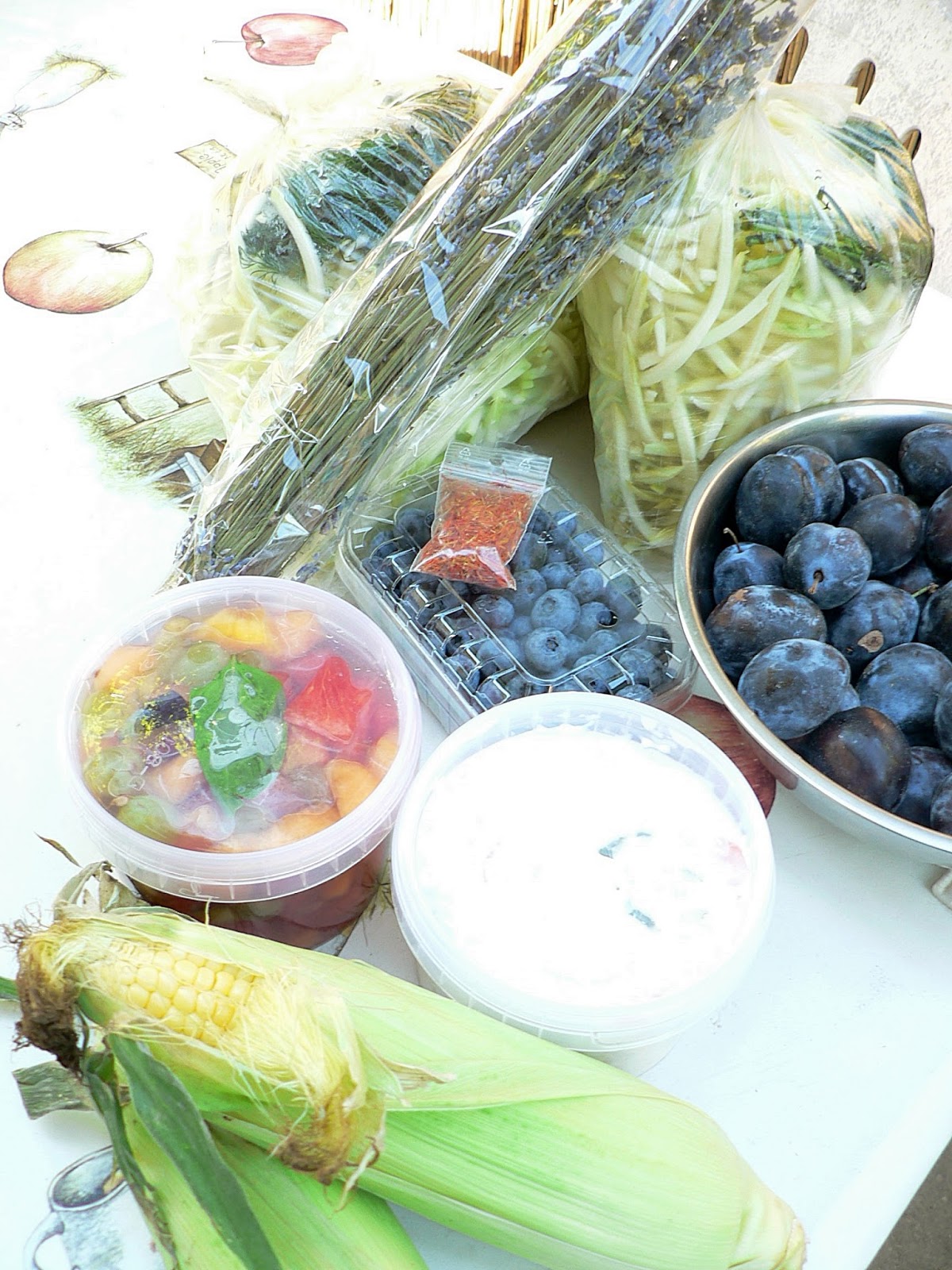 Vettünk szilvát, kukoricát, áfonyát, levendulát, joghurtos-és gyümölcssalátát, télire tököt. Ettünk lángost és sétáltunk a kellemes időben.