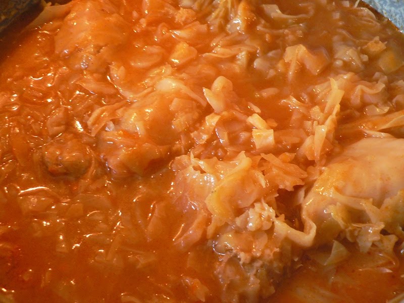 Egy nagy edény aljára tesszük a csíkokra vágott káposzta felét, majd a töltött batyukat és ismét a maradék csíkokra vágott káposztát. A forrázóvizet ráöntjük a káposztára, pont annyit, hogy ellepje /ha szükséges főzés közben pótoljuk a vizet/. Felforraljuk, hozzáöntjük a kevés vízzel elkevert paradicsompürét, megsózzuk és mérsékelt hőmérsékleten puhára főzzük.